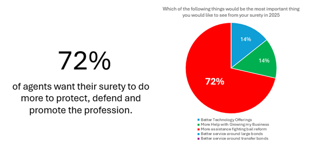 Much like the survey conducted last year, the most telling result from the survey was that a large majority of agents think that the MOST important thing their surety can do for them is to do more to protect, defend and promote the bail profession. This time the result was a whopping 72% compared to 40% last survey. With the bail reform movement still active across the country, it is not shocking that this result has become so top of mind with agents.